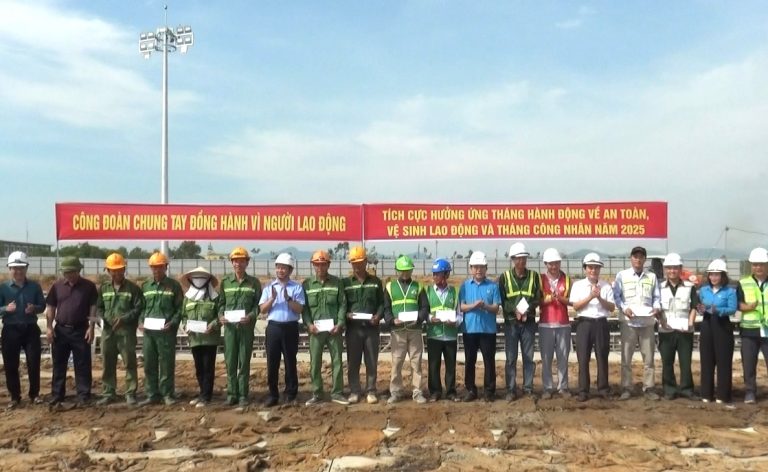 Liên đoàn lao động tỉnh Quảng Bình thăm, tặng quà, động viên người lao động Chi nhánh miền Trung thi công Dự án Mở rộng sân đỗ máy bay, Cảng hàng không Đồng Hới 08/05/2025