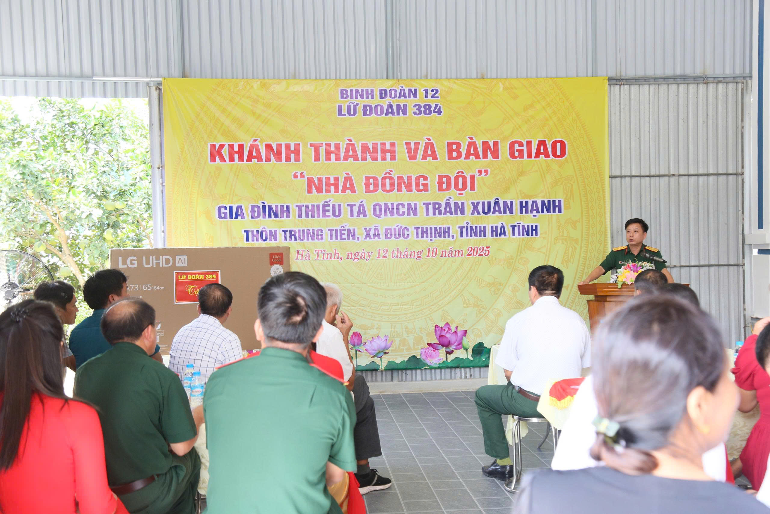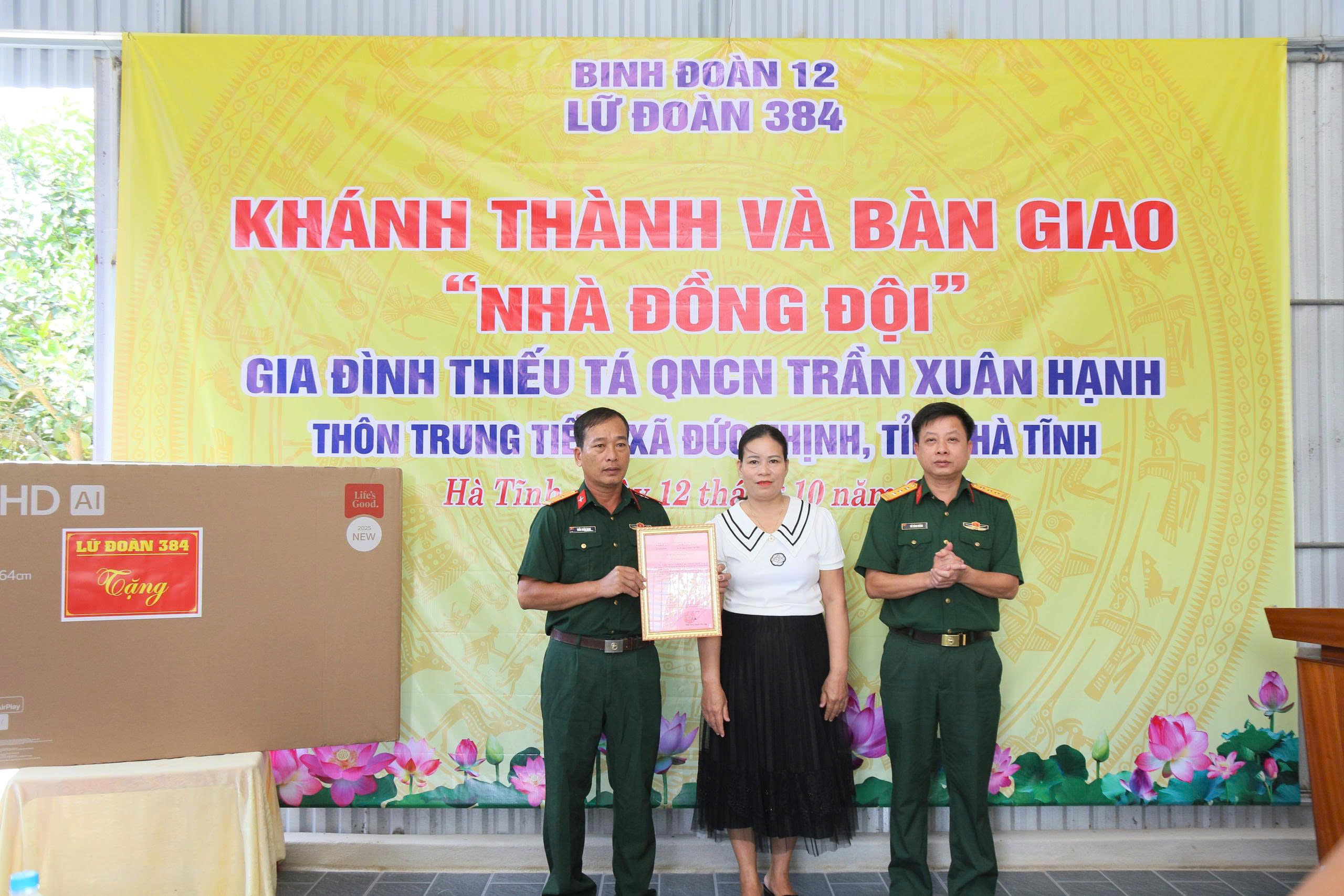 Đồng chí Thiếu tá QNCN Trần Xuân Hạnh đã có hơn 27 năm công tác trong Quân đội, có điều kiện đặc biệt khó khăn về nhà ở. Đến nay ngôi nhà đã hoàn thành, có diện tích 150m2 trong đó được hỗ trợ 60.000.000 đồng được trích từ Quỹ “Vì người nghèo 2025” Bộ Quốc Phòng, thể hiện sự quan tâm sâu sắc của Đảng, Nhà nước, Quân đội; đặc biệt là Bộ Tư lệnh Binh đoàn 12 và Đảng ủy, chỉ huy Lữ đoàn 384 (Công ty xây dựng 384); góp phần giúp gia đình Thiếu tá QNCN Trần Xuân Hạnh giảm bớt khó khăn trong cuộc sống. Trong 5 năm qua, Lữ đoàn 384 đã trao tặng 06 nhà Đồng đội và 02 Nhà Tình nghĩa cho các gia đình trong đơn vị và các gia đình chính sách, có công với cách mạng trên địa bàn tỉnh Quảng Trị.
